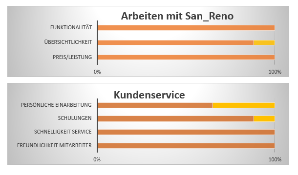 „San-Reno bietet viele individuelle Anpassungsmöglichkeiten und durch eine sehr serviceorientierte Kundenbetreuung fühlt man sich immer an der richtigen Stelle. Änderungswünsche werden schnell und zuverlässig umgesetzt und wenn man erst einmal die Erstdatenaufnahme hinter sich gebracht hat, sind alle Informationen zuverlässig an der richtigen Stelle.